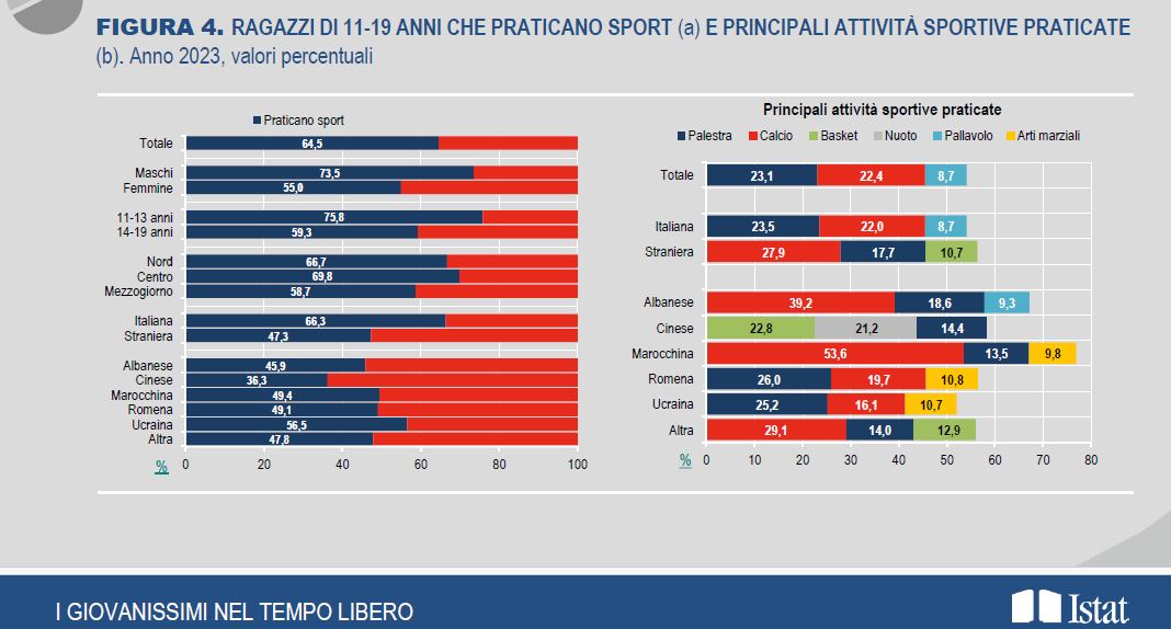 - Maschi: calcio (36,4%), palestra (20,3%), pallacanestro (9,6%).