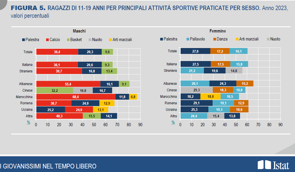 - Femmine: palestra (27%), danza (17,2%), pallavolo (21,2% tra straniere).