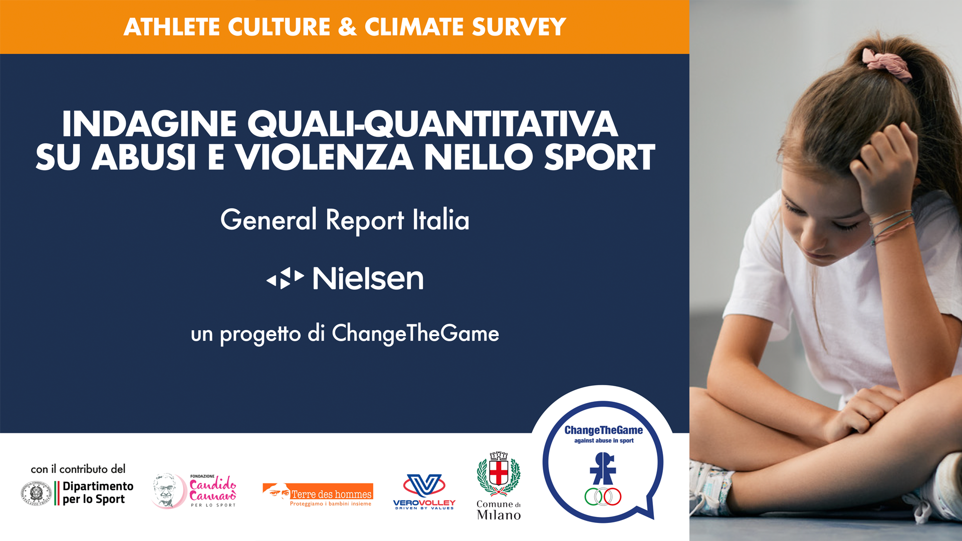 L’indagine Athlete Culture & Climate Survey sugli abusi e le violenze nel mondo dello sport in Italia, è stata commissionata da ChangeTheGame a Nielsen con il contributo del Dipartimento per lo Sport della Presidenza del Consiglio dei Ministri, di Terres des Hommes, del consorzio Vero Volley e la Fondazione Candido Cannavò.