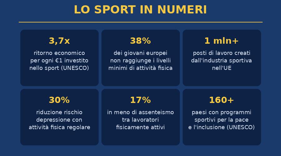 - Risultati educativi e lavorativi: lo sport sviluppa competenze cognitive e non cognitive utili per l'istruzione e il lavoro. Gli interventi sportivi ben strutturati possono migliorare la frequenza scolastica, le prestazioni accademiche e le opportunità di lavoro, riducendo il numero di giovani che non studiano né lavorano (NEET).
