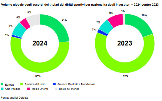 Il Nord America resta il principale investitore (55% del volume totale nel 2024), mentre l’Europa cresce al 24% con il 48% del capitale investito in asset sportivi europei.