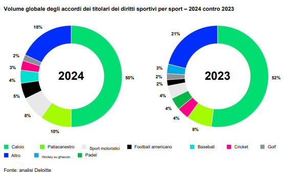 Sport motoristici: raddoppia la quota di deal (8% nel 2024), con operazioni come l’acquisizione di MotoGP da parte di Liberty Media e l’ingresso di GM/Cadillac in Formula 1.
