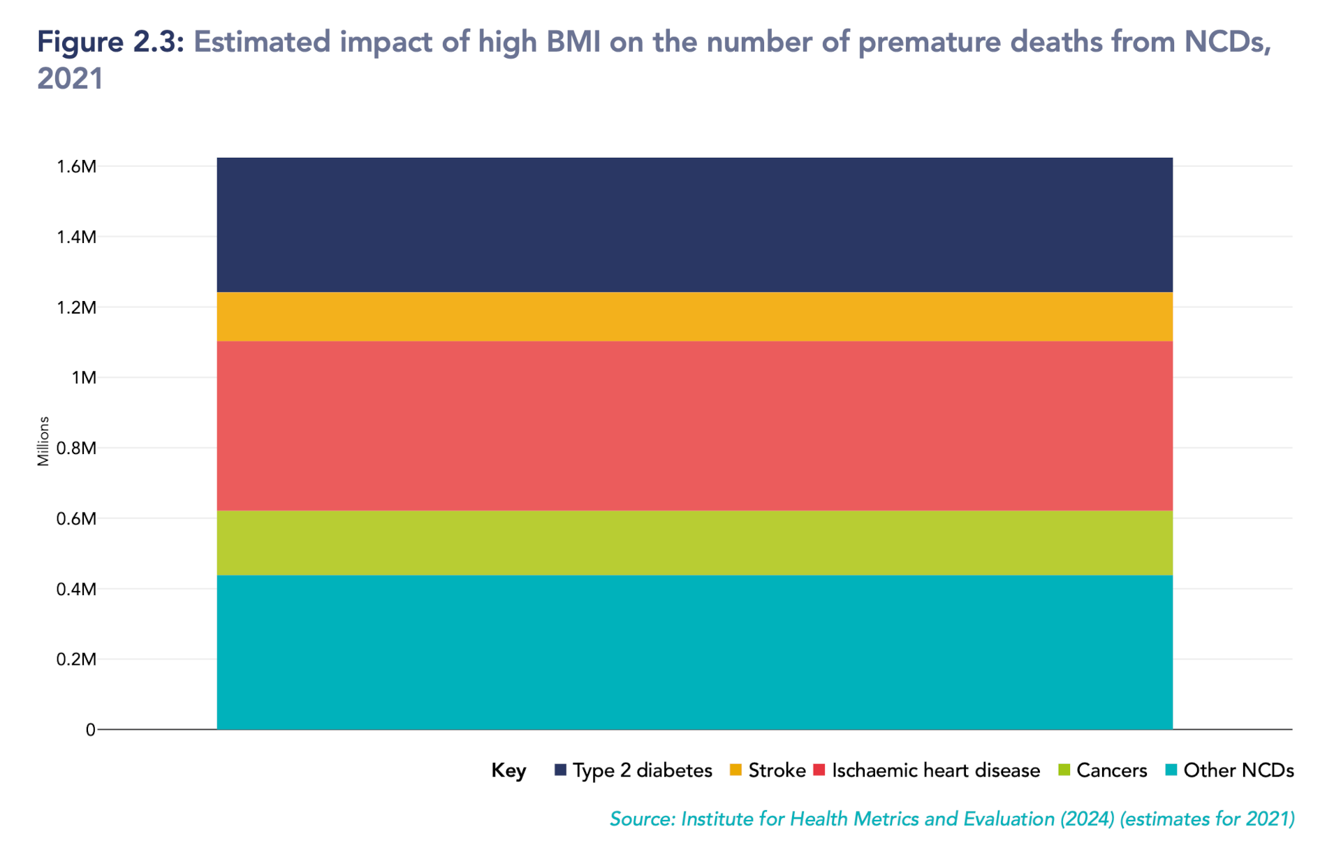 Figura 2 – Morti premature attribuibili a BMI elevato per tipo di malattia (2021). Fonte: World Obesity Federation, 2025.