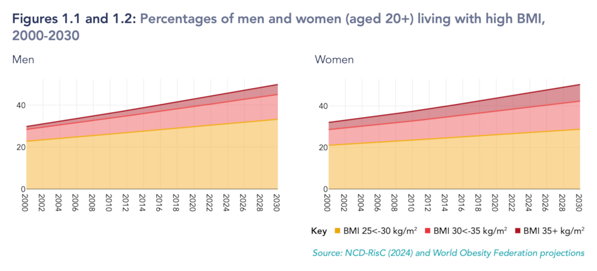 Figura 1 – Andamento globale della prevalenza di BMI elevato (2000-2030) per uomini e donne. Fonte: World Obesity Federation, 2025